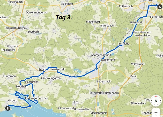 In Roth beginnt Ihre heutige Radtour. Die heutige Etappe führt Sie von Ansbach über Bernlohe, Wasserzell, Stockheim an den Brombachsee. Heute folgen Sie dem Routenverlauf der Zwischenroute 2 von Roth an den Brombachsee. Zunächst radelt man dem Verlauf der Rednitz folgend nach Süden. Bald tauchen Figuren aus Holz, Stein und Eisen neben dem Radweg auf. Sie sind Teil des Gmünder Skulpturenwegs, der die Radler nach Georgensgmünd mit seinen typischen Sandsteinbauten und faszinierenden Spuren jüdischer Geschichte führt. Weiter führt der Weg nach Spalt. Das Museum HopfenBierGut läd zu einem Zwischenstopp ein. Das historische Kornhaus, ein imposantes Fachwekgebäude, liegt am Rand der historischen Altstadt. Weiter geht es Richtung Großweingarten – hier ist ein steiler Anstieg zu bewältigen – die Panoramaaussicht auf den Großen Brombachsee belohnt die Radler für ihre Anstrengungen – und macht Lust auf die Abfahrt an den See nach Enderndorf. Das letzte Stück Ihrer Etappe führt Sie emtlang des Sees nach Absberg.